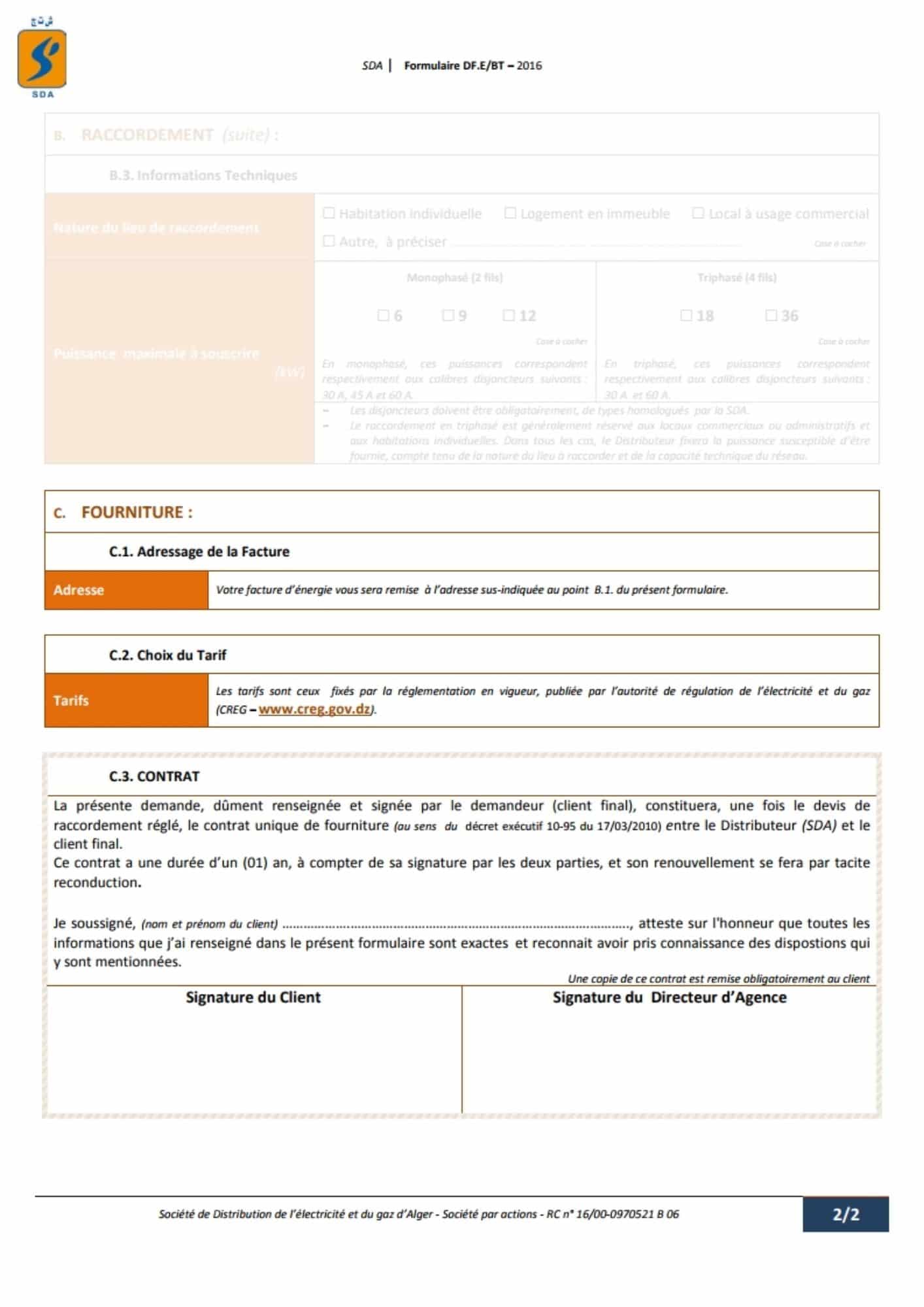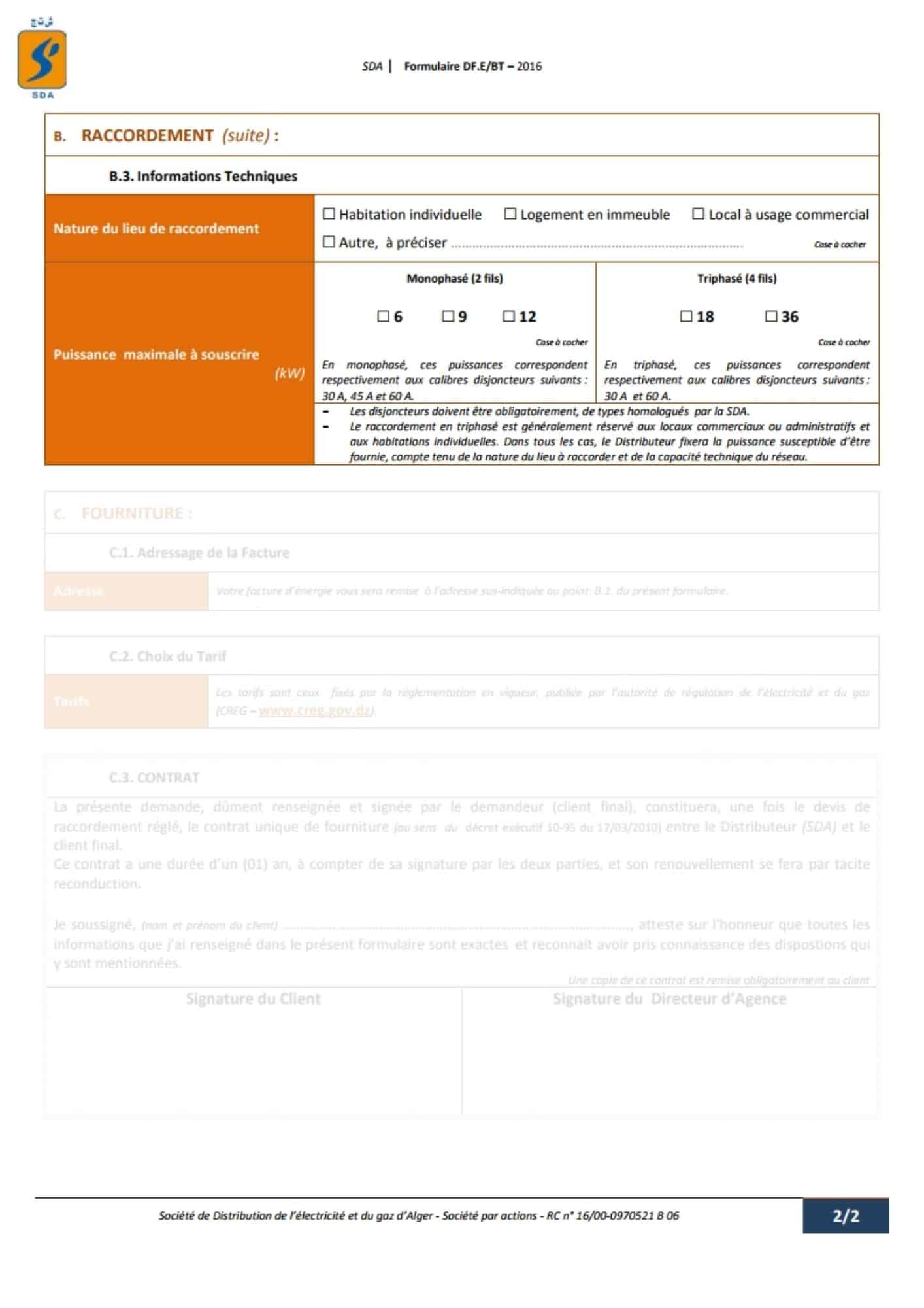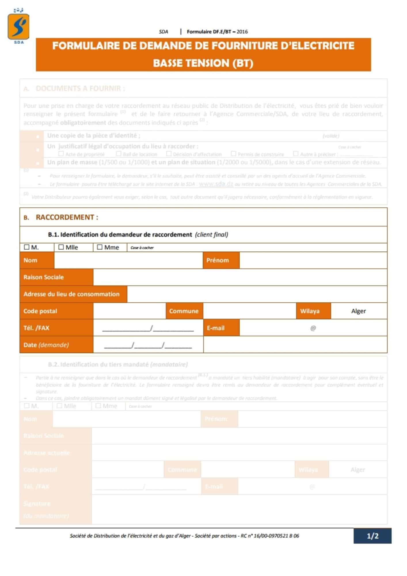 Le formulaire officiel est disponible en ligne sur le site de la société de distribution d’électricité et de gaz Alger SDA, ou directement en agence. Remplir ce document n’a rien d’insurmontable, mais chaque champ mérite votre attention :