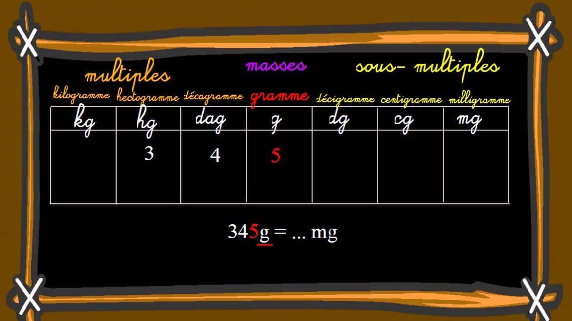 Votre tableau de conversion de kg doit comprendre 7 colonnes. La première en partant de votre gauche correspond au kg. Il faut ensuite placer dans les autres colonnes une unité sous-multiple de kg en suivant l’ordre ci-dessus. Une fois représenté, placer dans votre tableau le nombre à convertir en plaçant le chiffre qui correspond à l’unité dans la colonne du kilogramme.